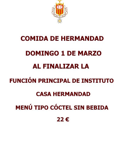 La Hermandad celebrará, el próximo domingo 1 de marzo, Comida de Hermandad al término de la Función Principal de Instituto. La convivencia tendrá lugar en la Casa de Hermandad, con un importe de 22 euros por persona (sin bebida), menú tipo cóctel: Surtido de Quesos varios (gouda, emmental y oveja curado) Surtido de Salchichón